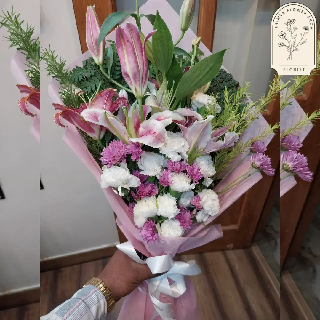 Colour of Flowers: Daisy 2, White Carnation 10, Pink Lily 2,